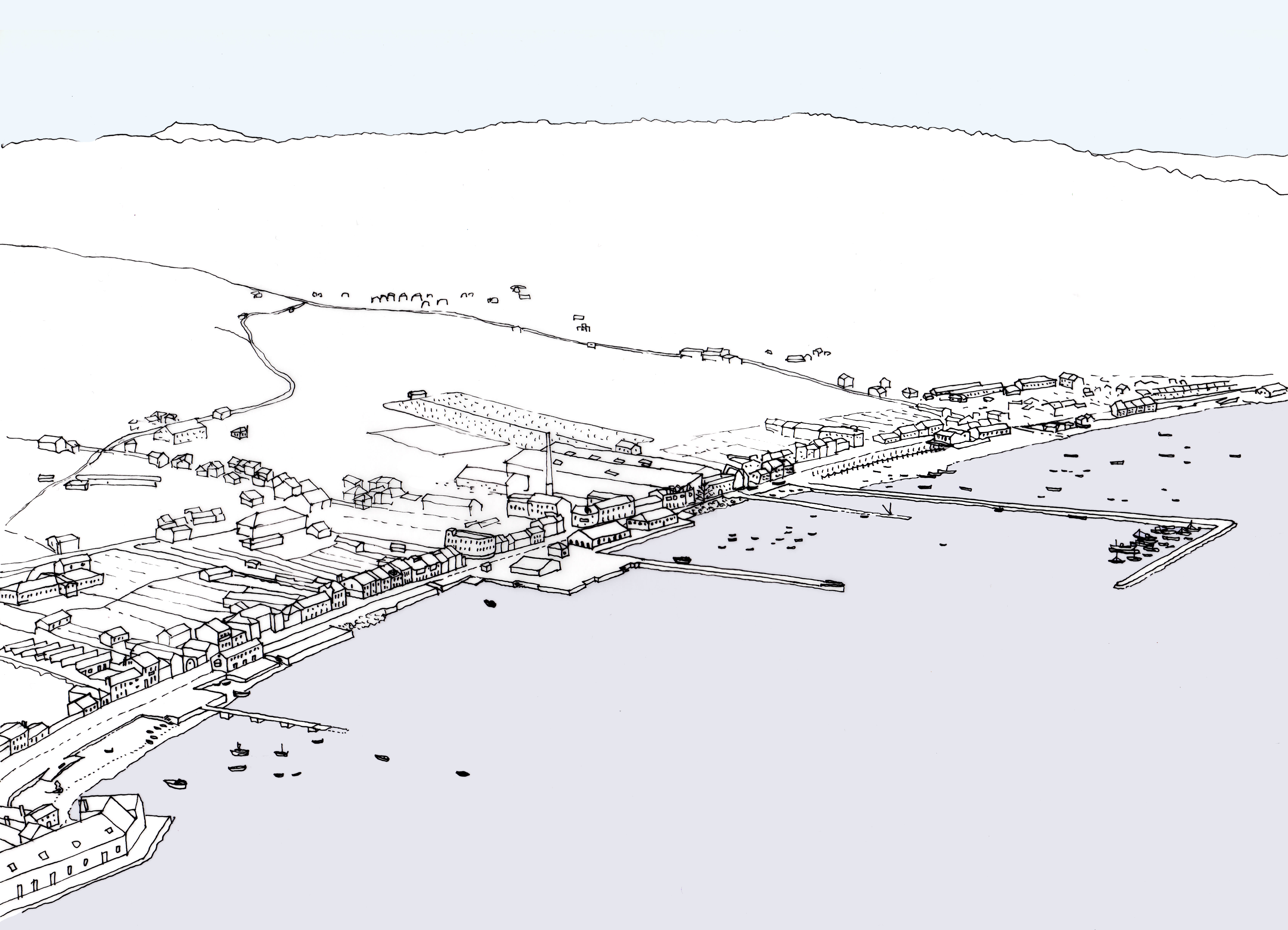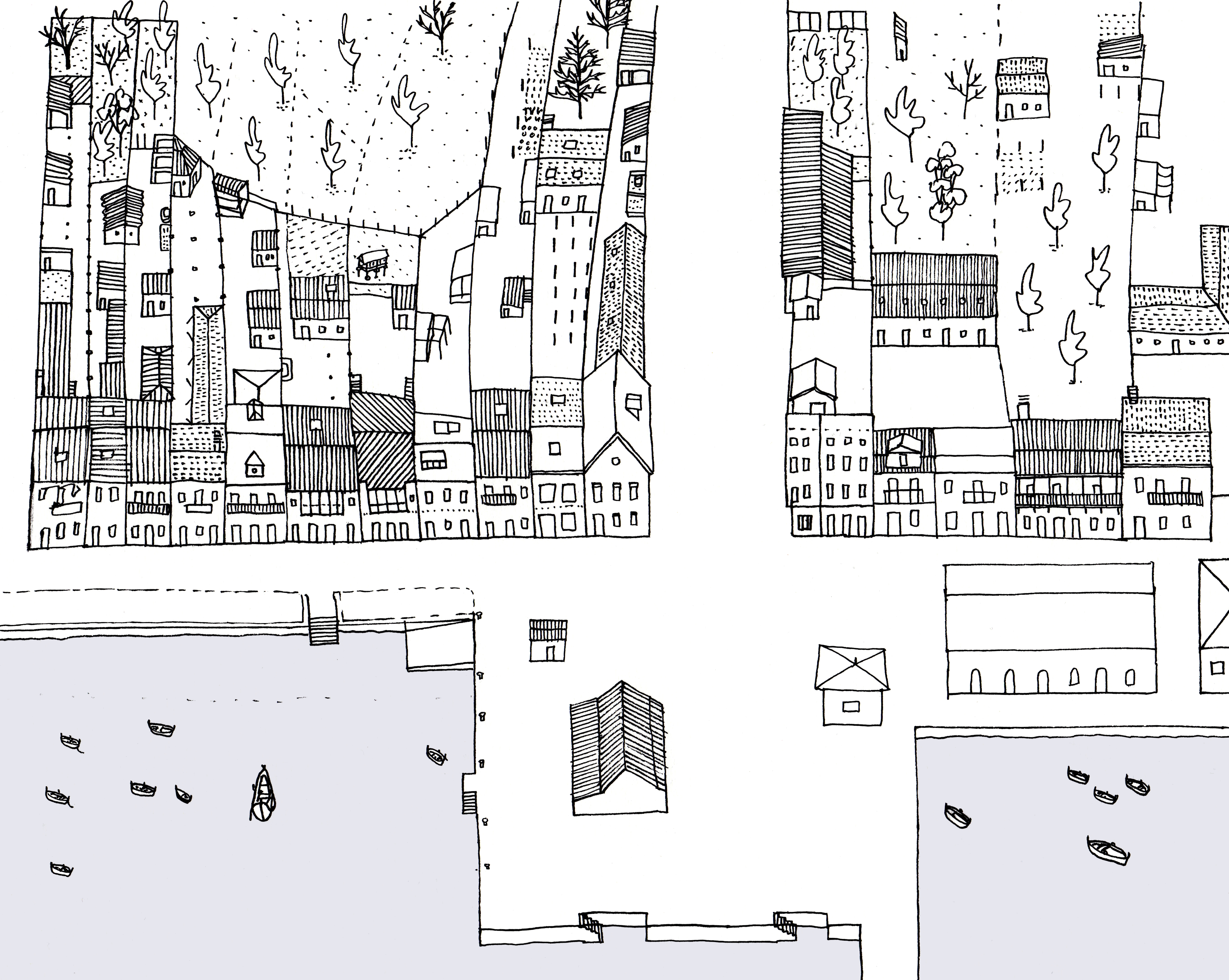 Los dibujos exploran esa fina línea que separa el mundo marítimo (las embarcaciones y espacios que le dan soporte) de las vivendas y tierras de cultivo. Ese Fronte ao mar -frente del mar o enfrente del mar, en gallego- es el que articula los dibujos en sus diferentes perspectivas.