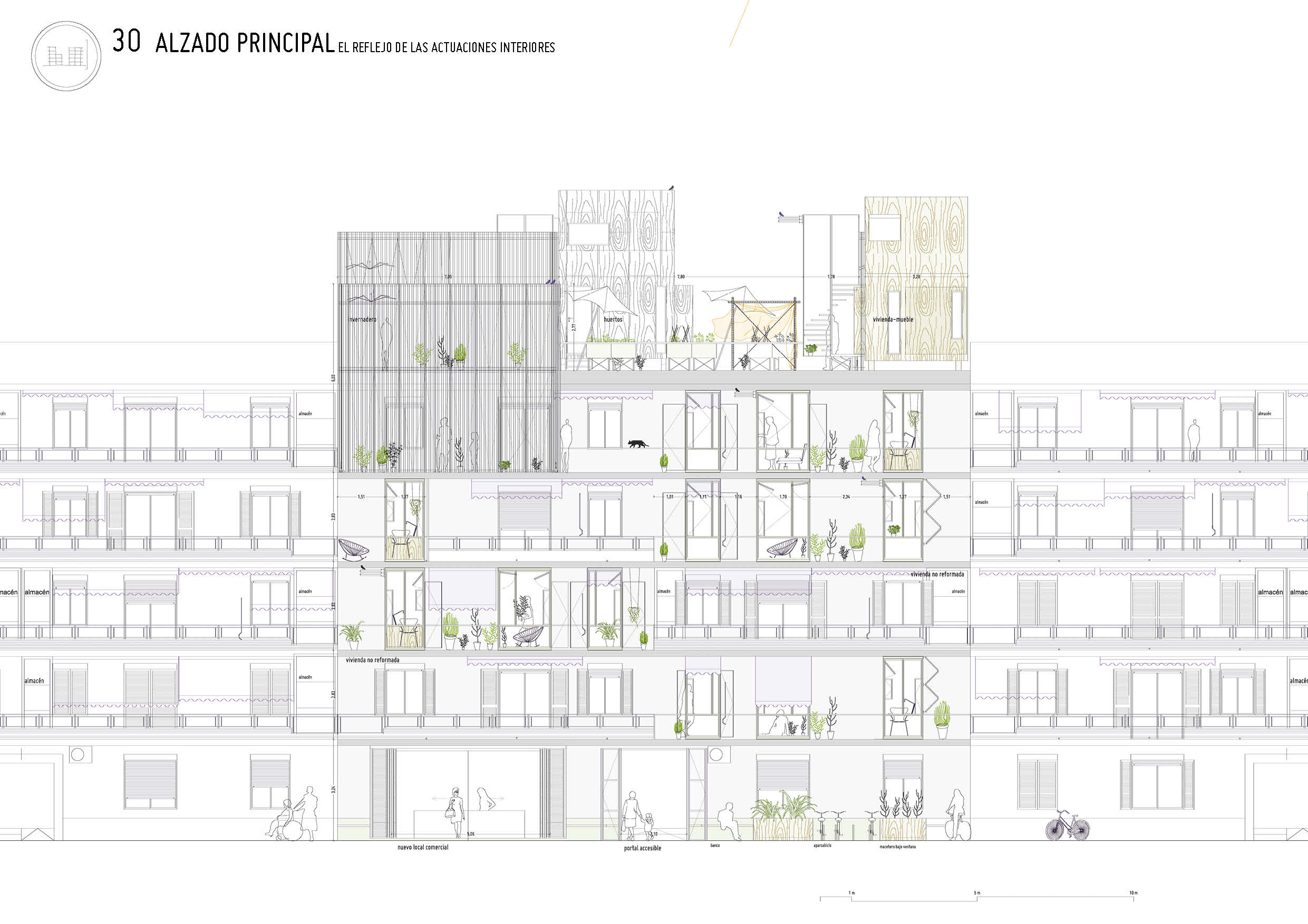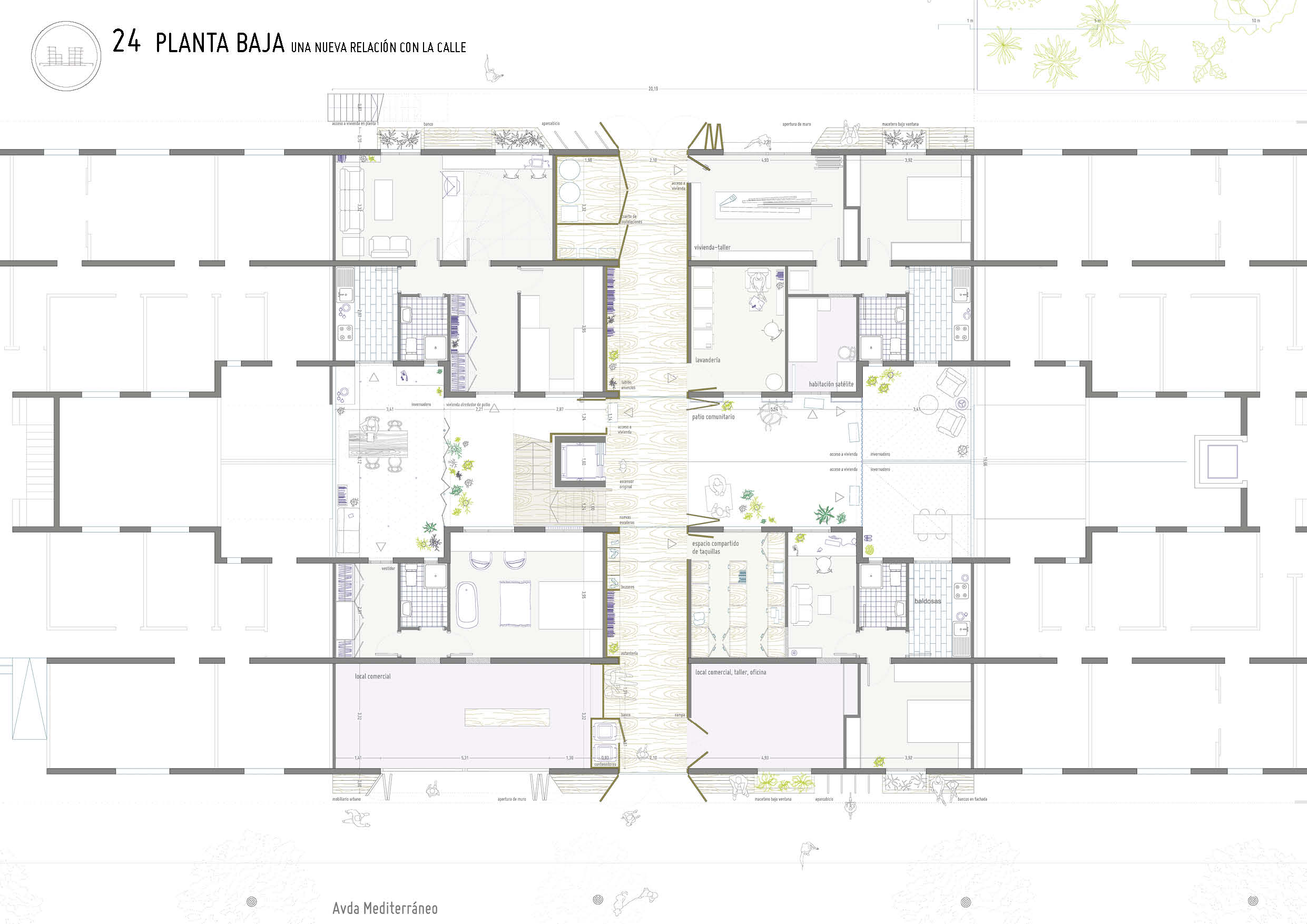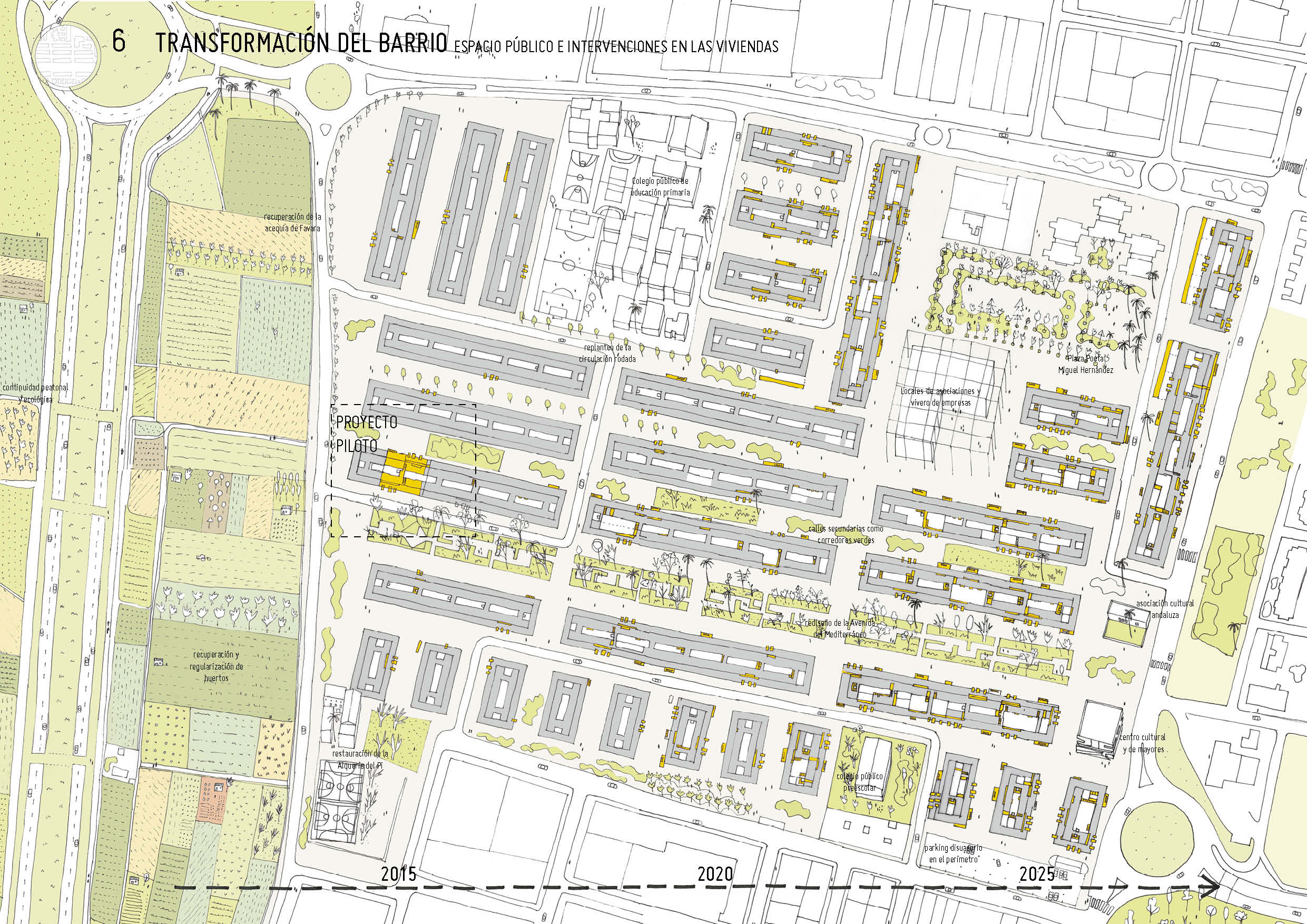 Una serie de estrategias de intervención -accesibilidad, eficiencia energética y reprogramación de espacios- en un barrio de vivienda obrera de la periferia valenciana, posibilitadas gracias a un sistema de espacios compartidos.