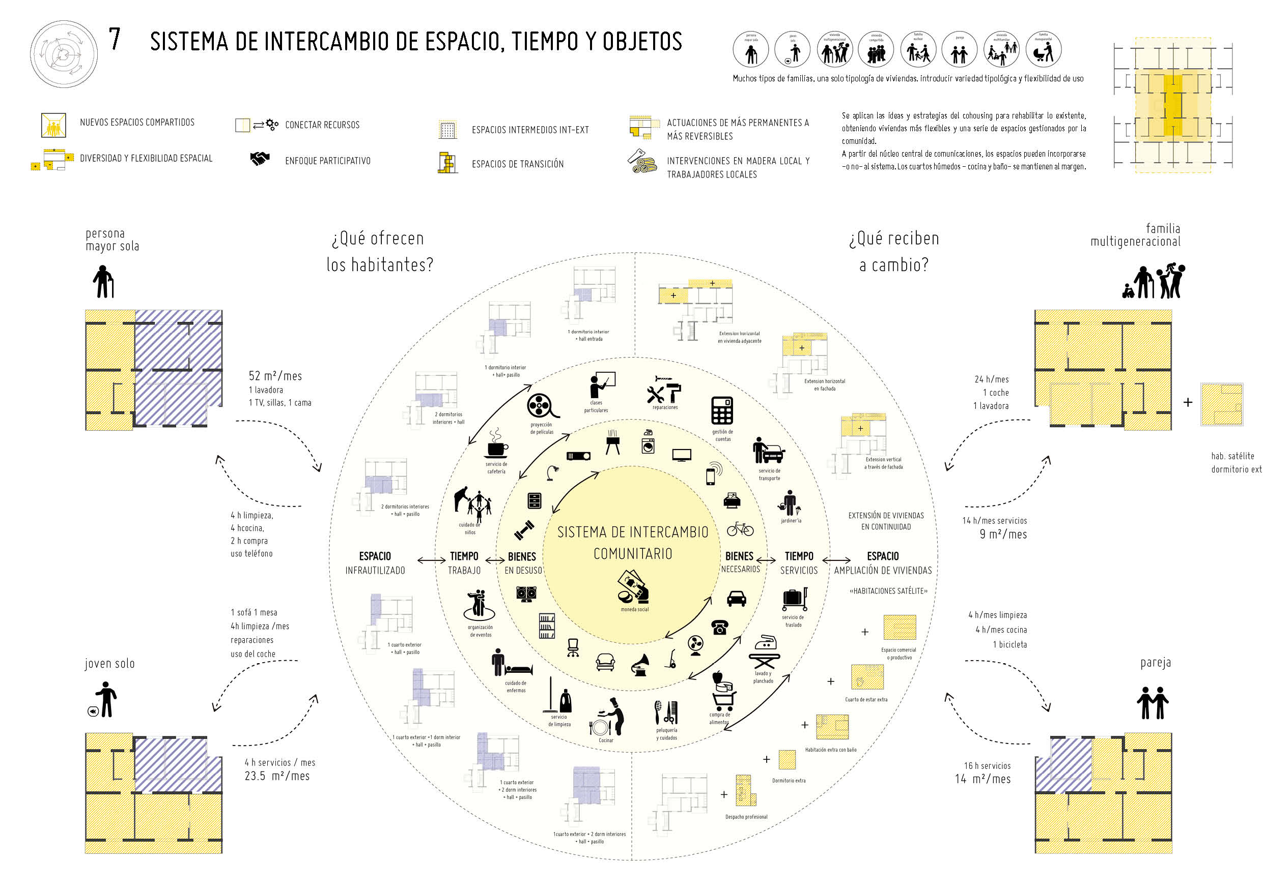 In face of all the current complex challenges that are apparent even at a neighborhood scale -the ecological crisis, the social inequalities and the speculation with a basic necessity such as housing, the undesired loneliness and lack of sufficient social services for the elderly -and the burden it implies for women-, the lack of valorization and remuneration of reproductive work that leads women -main caretakers in a patriarchal society – to be economically dependent, the disappearance of social ties…: It is necessary to try new ways of living and sharing, to experiment with other models such as cohousing with assignment for use against speculation, time banks or social currencies. Could we try and combine them at a small scale? Could we apply cohousing strategies to an existing built and social environment? Could we place care at the center of it all?