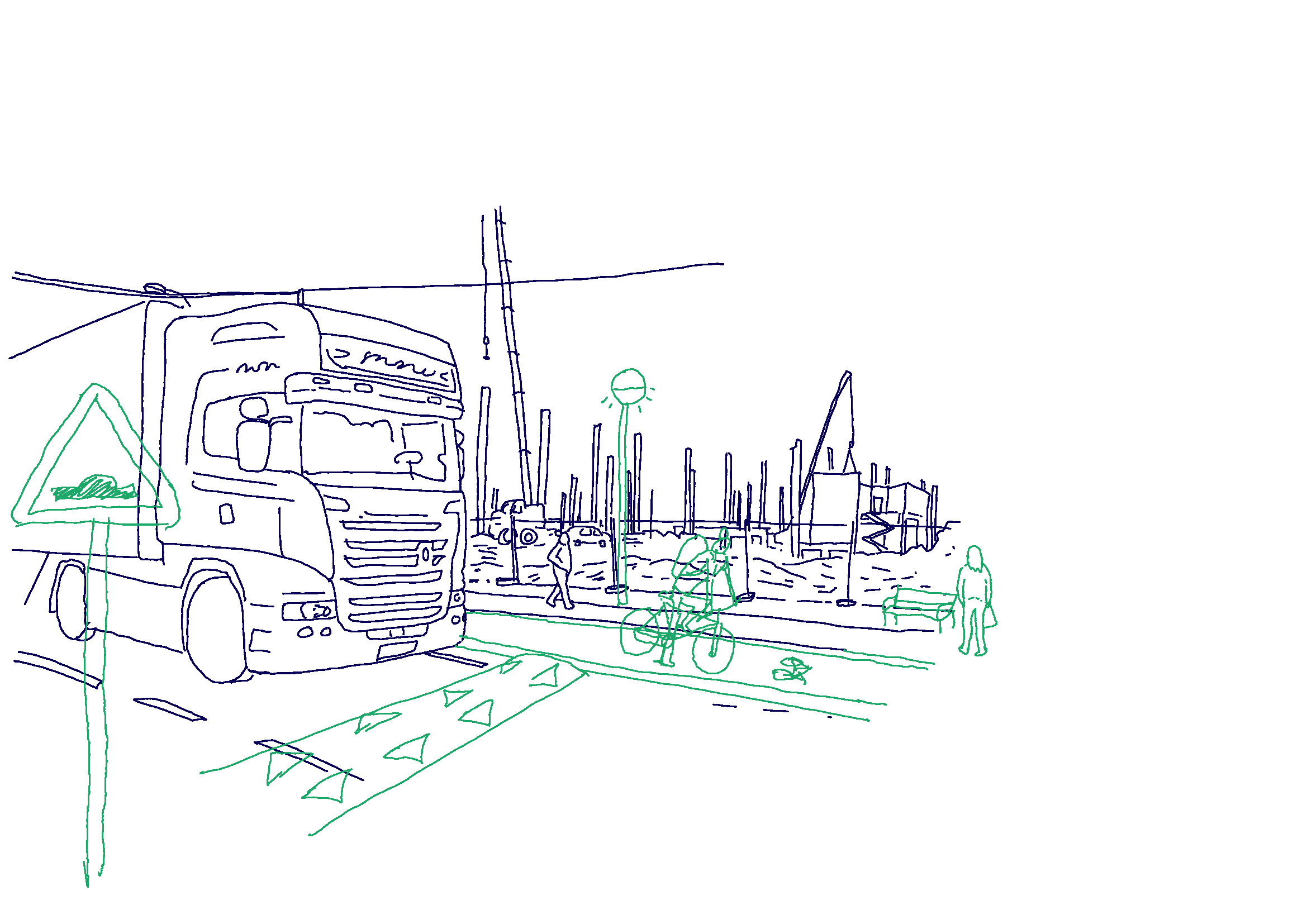La vertiginosa implantación de plataformas logísticas, cuya impactante volumetría y proliferación se constata a simple vista como una dinámica atosigante, afecta no sólo a la percepción del espacio público en su entorno, sino a la propia condición de ciudad del polígono; y tiene implicaciones en todo el Distrito especialmente por todo lo que su presencia está obstaculizando. Las plataformas logísticas están fagocitando un tejido industrial que podría ser rico y diverso, agradable para caminar, complejo y generador de oportunidades de empleo. Estos paisajes logísticos que se (nos) están imponiendo son lo contrario a la proximidad, a la diversidad, a la visibilidad, a la conectividad, a la inclusión: en definitiva, a todos los valores que caracterizan a un urbanismo (eco)feminista que tenga en cuenta los cuidados y la vida.