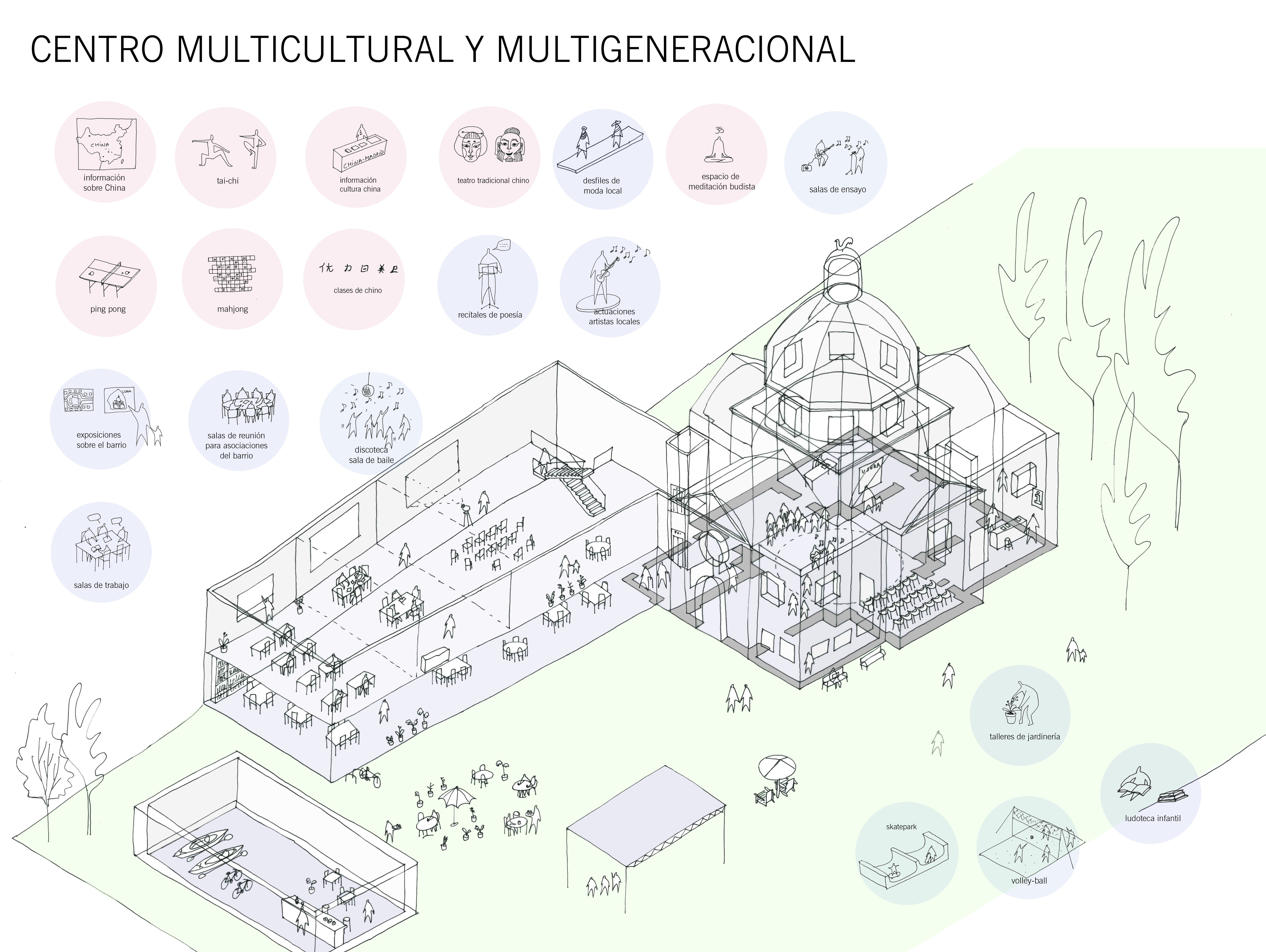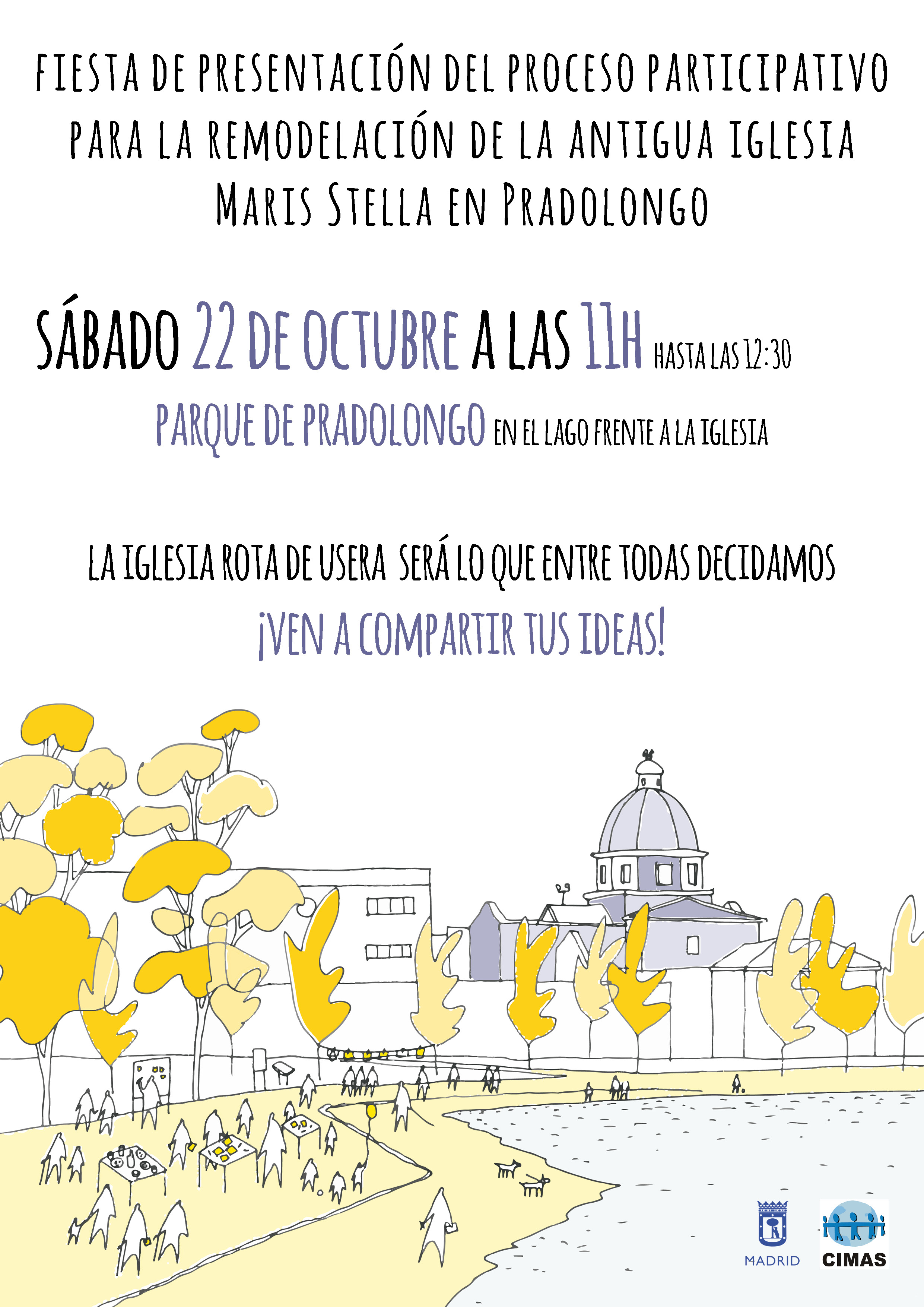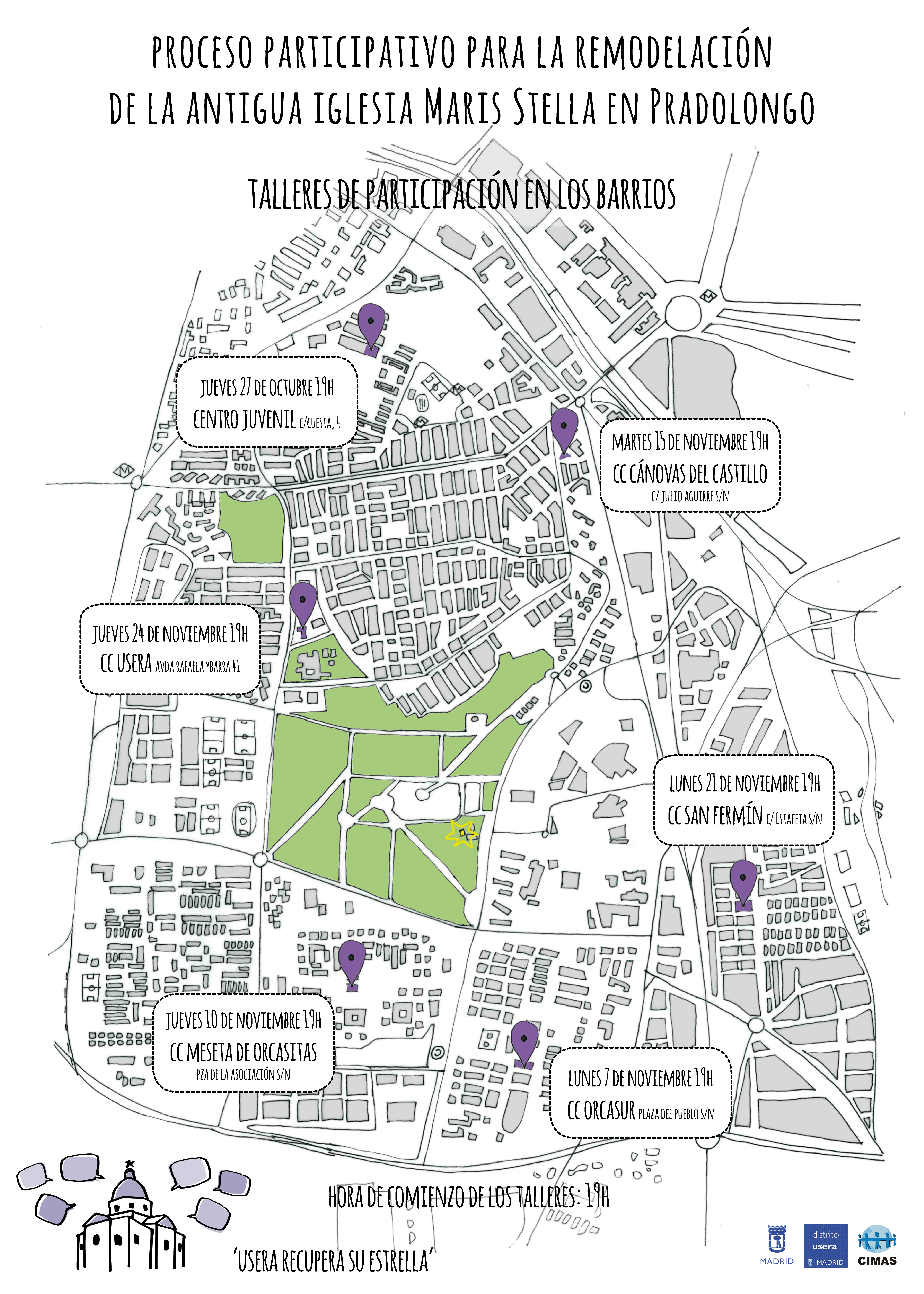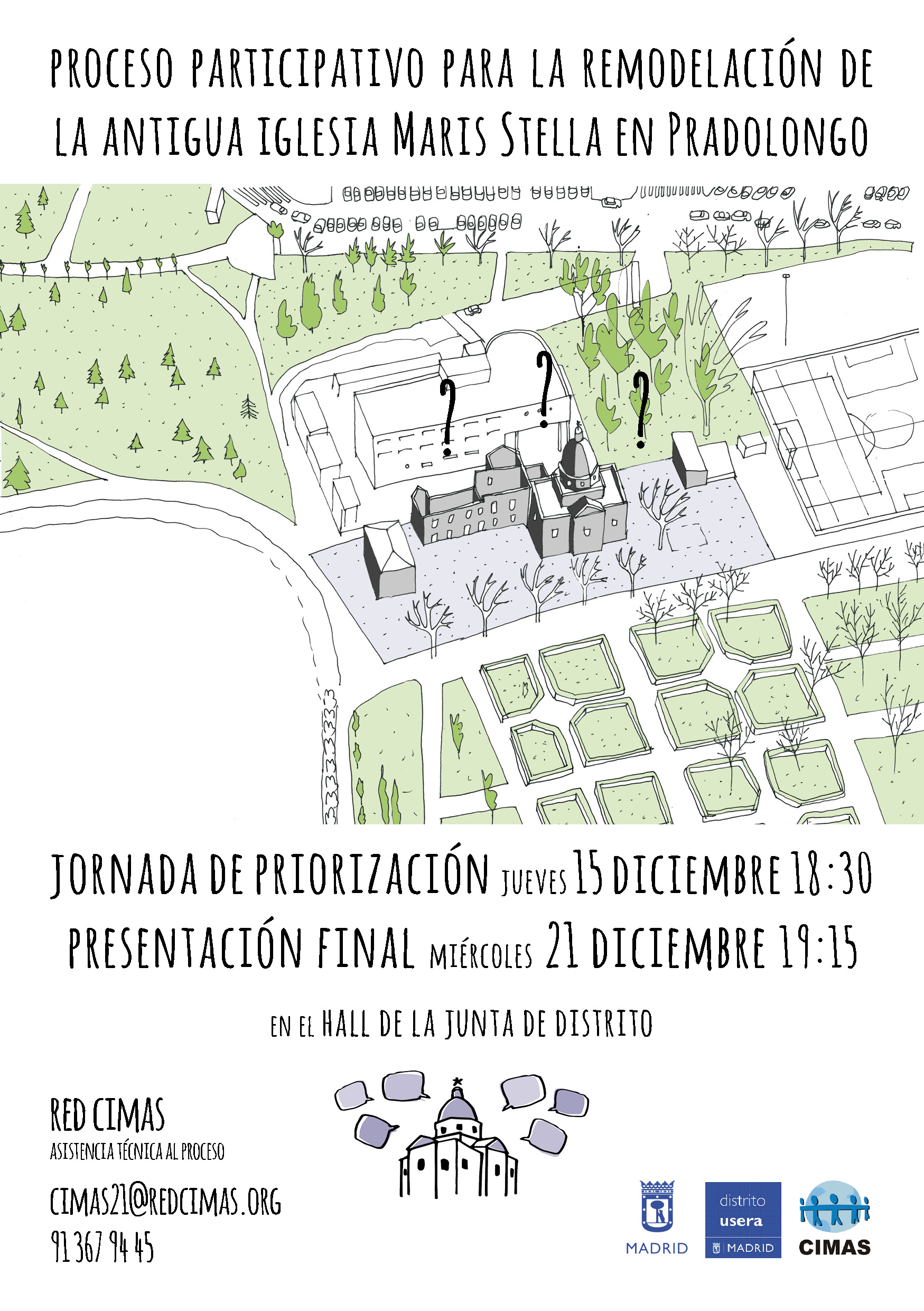Proceso participativo contratado pro la Junta de Distrito de Usera y realizado junto a CIMAS para decicir los usos de la iglesia Maris Stella, en el Parque de Pradolongo, Usera.